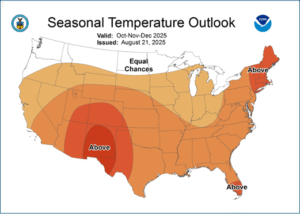 A true sign of fall, the arrival of pumpkin flavored drinks at coffee shops, sends us to NOAA for a look at its seasonal temperature outlook for October – December. Above average chances of high temperatures are forecast for most of the nation. New England, which is coming off an unseasonably warm summer, is the most likely to experience a warm fall among the jurisdictions served by ENGIE Resources.